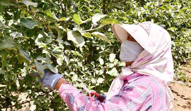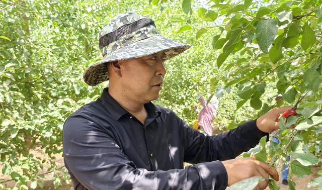 5月20日,是平凉今年首个高温天气,气温达到33℃,果园里的地面最高温度达到42℃,崆峒区四十铺镇高堡村种苹果大户高军民正在果园为果树疏果,他说,当下天气正热,正是果树管护的“关键点”,果园管理“黄金期”。