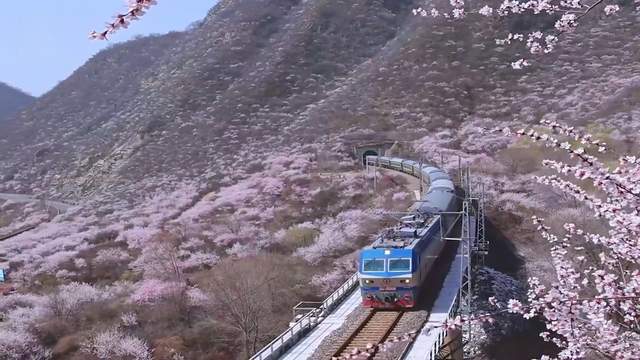 图为:崇信县铜城峡口列车穿越花海,呈现“开往春天的列车”的美景。