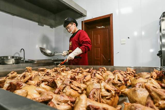 其次,卤制工艺也必须讲究。酥香软烂是烧鸡最受人欢迎的原因之一,美味的烧鸡并不是直接就能烧出来的。每只鸡都采用百年循环老汤,配以二十多种名贵中草药和佐料,经过十九道工序制作而成,确保食材的新鲜与口感。