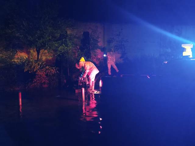 23日晚上20:40,“连轴转”了一天,已经一身疲惫的王博逸又接到G344线K1785+600处路面积水严重的报告,忍着倦意,他又马不停蹄冒着倾盆大雨赶往现场,协调各方力量,调用2台大型污水抽水设备在下游抽排积水,自己则带领抢险人员在上游堆积防洪沙袋,一呆就是九个小时。