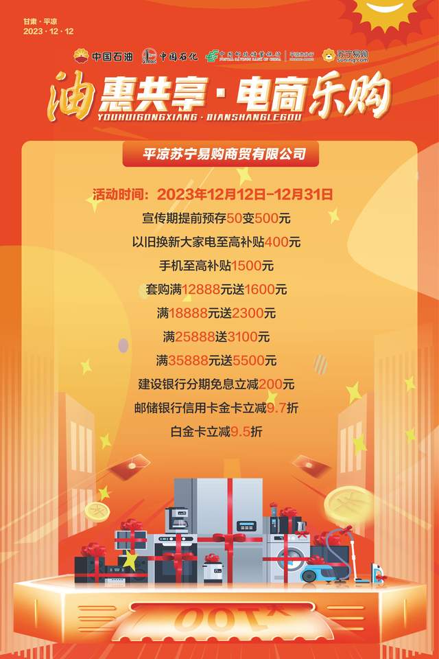本次活动以“油惠共享·电商乐购”为主题,平凉市商务局主办,中石油甘肃平凉销售分公司、中石化甘肃平凉石油分公司、中国邮政储蓄银行平凉市分行、平凉苏宁易购商贸有限公司承办,是我市年末岁首加大优惠支持力度,以企业优惠活动为主,通过线上充值、加油抽免单、会员日活动,吸引成品油、家用电器消费客户及客户群体广泛参与,进一步强化稳定成品油等大宗商品消费,扎实推动稳经济各项政策落地见效的一次大型促销活动。