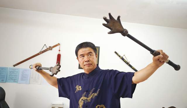 在学校的器械陈列室,王镖展示了一件造型奇特的“崆峒金刚虎抓”。“这就是‘天下奇兵出崆峒’的代表。”他介绍,崆峒武术最显著的特点便是奇门兵器,这些由农具、生活用具转化而来的兵器,凝结着陇原先民的生存智慧。明末清初,平凉作为边关重镇,守关将士与百姓将锄头、扁担化为御敌武器,逐渐演化出独特的兵器技法。如今,教练李文强带领的传统班,仍在传承着这些古老技艺。去年在兰州举办的非遗博览会上,平凉团队表演的“崆峒奇门兵器”,让观众惊叹于崆峒武术的奇诡精妙。