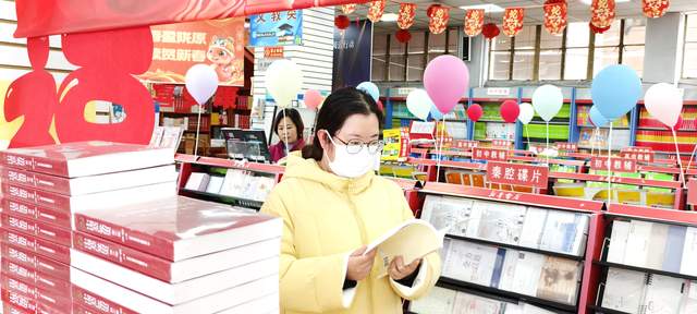1月30日,大年初二,新华书店玻璃窗上喜庆祝福和店内新装布置相映成趣,书店内洋溢着喜庆年味和浓浓春意。一进入书店内,记者就看到许多人或站或坐或行走浏览,有的在书架前挑选书籍,有的认真阅读。