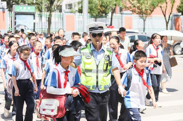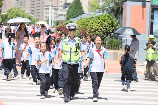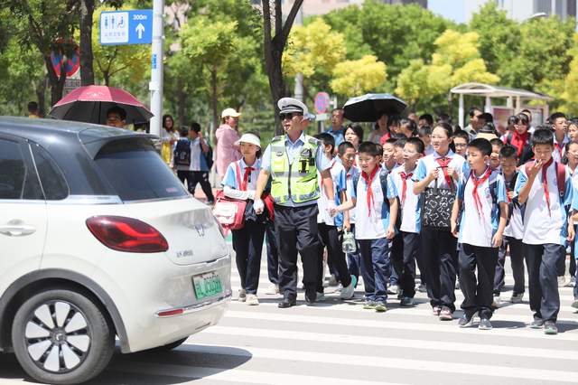 当日放学时段,学校门口及周边路段人流、车流剧增。交巡警大队民警们头顶炎炎烈日,坚守执勤岗位,有条不紊地开展交通疏导工作。他们有的站在路口指挥交通,引导过往车辆减速慢行、有序通行;有的在斑马线旁,护送学生安全过马路;还有的对乱停乱放车辆进行劝导,确保道路畅通无阻。