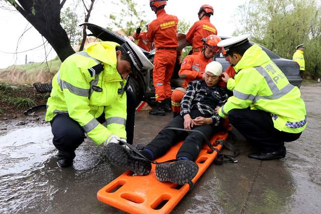 2023年5月7日,甘肃省平凉市崆峒区道路交通事故救援演练现场,消防、交警联合救出“被困人员”。