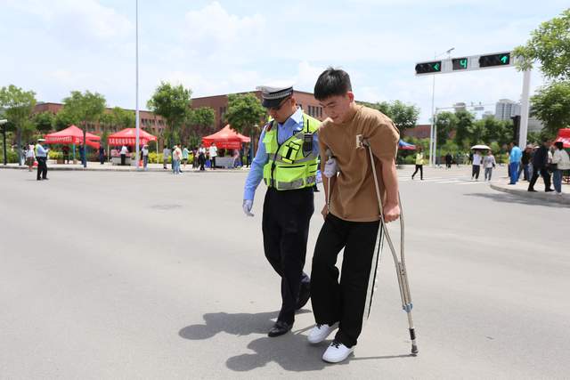 2023年6月7日,是全国高考第一天。甘肃省平凉市公安局崆峒分局民警帮助行动不便的考生过马路。