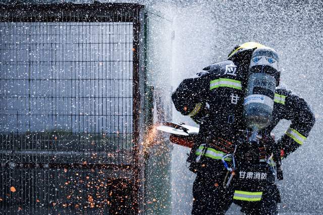 2023年8月30日,在甘肃省平凉市崆峒区消防救援大队训练场,消防救援人员正在破拆钢板。