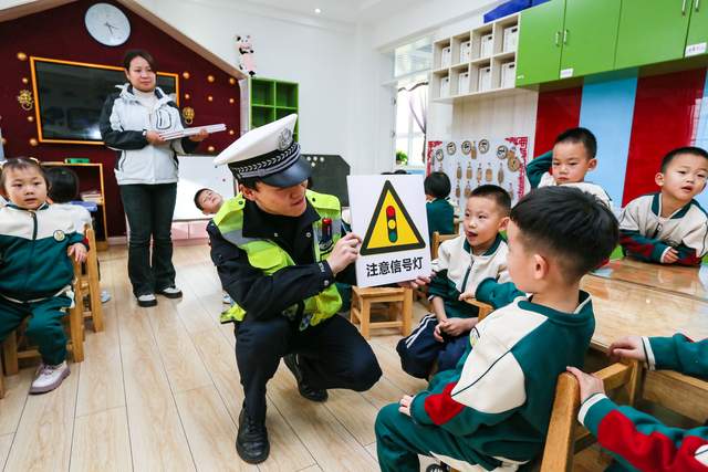 2023年11月27日,在甘肃省平凉市崆峒区实验幼儿园中三班教室内,民警为小朋友们介绍交通信号指示标识牌。