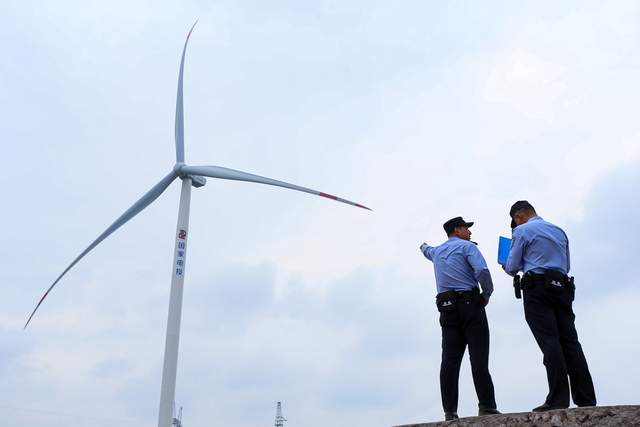2023年9月5日,甘肃省平凉市公安局崆峒分局崆峒派出所的民辅警在风力发电项目施工现场安全巡查。