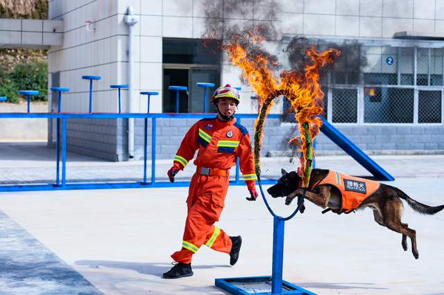 2023年9月21日,甘肃省平凉市隆重举办消防行业职业技能竞赛暨全员岗位大练兵比武对抗赛。图为消防救援犬钻火圈展演。