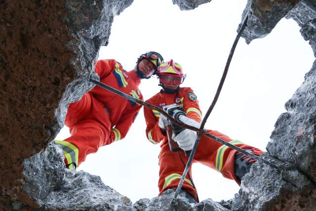 2023年6月2日,甘肃省平凉市泾川县消防救援大队的消防员正在训练向上向下破拆科目。
