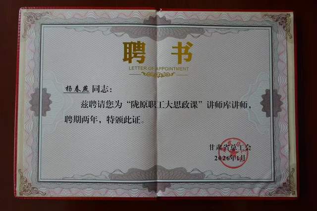 新传媒在线网讯(特约记者杨树 丁丽萍)近日,泾川县越强宏大实业有限公司细纱车间主任、甘肃省劳动模范杨春燕被省总工会聘为 “陇原职工大思政课” 讲师库讲师,并为其颁发聘书,聘任期限两年。这是对她三十年如一日坚守纺织一线、践行劳模精神的肯定,也为职工思政教育注入了鲜活的一线力量。