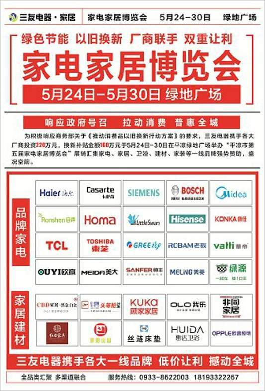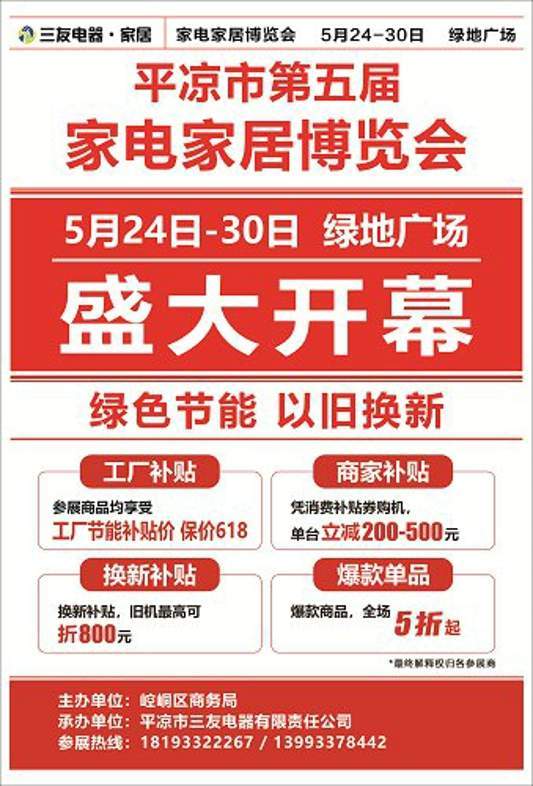 新传媒在线网讯(张镜镜)5月24日,平凉市家电家具以旧换新暨第五届家电家具博览会在绿地广场盛大开幕,平凉三友电器携手各大知名厂商将持续展销至5月30日,各种 补贴折扣实惠到家。