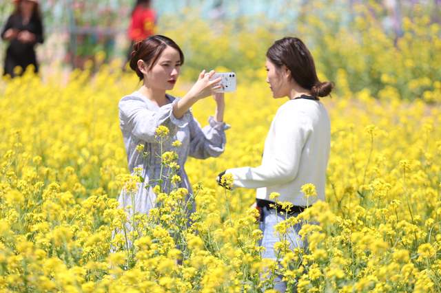 山青青、水蓝蓝,万亩油菜花田艳,无垠沃野,一片金黄。阡陌熙熙,花海攘攘。一下车同行的女同胞 欢呼雀跃,换装进入花海。天下黄河九十九道弯,汉中花海如黄河涌动,沃野黄色弯套弯。那是天堂泻下的万吨黄金,那是仙女展开的万里黄绫,那是人间餐锅里的万吨油香。蜜蜂嗡嗡、蝴蝶翩飞。黄里间隙,套种的美人梅、玉兰花和低矮嫩绿的葱韭,把这里的大地拉开了层次。赤橙黄绿青蓝紫,七色绝美艳的出奇,在这里,女游客忘记了自己的年龄,都成了的油菜花的情人,贴花拍照,抱花拍快手,吻花做抖音,忙的不亦乐乎。拉长各种色彩的纱巾飘在头顶,洁白的衣衫,飘逸的长发,启唇的笑靥,升腾起自己的灵魂,观花海,闻花香,徜徉其中,活脱脱变成了花海中的女神。