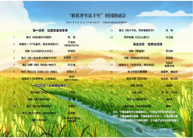 宁强20余名朗诵爱好者、文艺志愿者和本土作家朗诵了与稻田、秋天有关的经典文学名篇和本土作家作品。县新时代文明实践中心志愿者进行了主题为“珍爱粮食 从我做起”微宣讲。