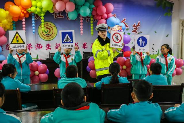 宣传民警结合校园周边交通环境和学生出行特点,通过以案说法、展示交通指示标志牌、开展互动游戏、发放宣传资料等方式,为学生们详细讲解了如何安全过马路、安全骑车、正确乘车以及遇到交通事故后怎样拨打报警电话等基本常识,提醒广大学生不要在马路上追逐打闹,自觉遵守交通法规,增强自我防护意识。同时结合“一盔一带”宣传,民警讲解了骑乘电动车正确佩戴安全头盔和乘车系安全带的重要性和必要性,并结合“小手拉大手 平安四加一”活动,呼吁同学们争当交通安全的践行者和宣传员,把学到的交通安全知识带给家人和朋友,通过一个学生,影响到一个家庭,带动整个社会,积极营造安全畅通、文明有序的道路交通环境。